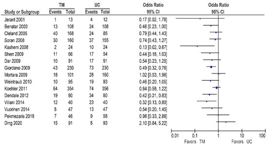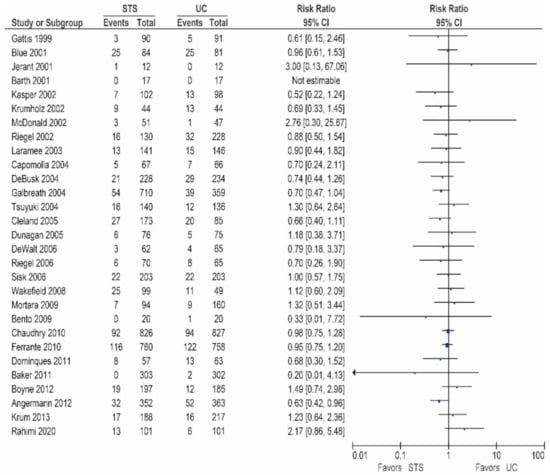 Seventeen of the other studies reported data on all-cause hospitalization rates, as shown in Table 4/Figure 5 [32,42,48,53,55,56,57,58,59,60,62,65,66,67,70,71]. Of these studies, two demonstrated a significant reduction in the all-cause hospitalization rates [63,70], while seven studies reported a non-significant reduction [32,42,53,58,59,62,65]. In contrast, eight studies did not report a beneficial effect [48,55,56,57,60,66,70,71].