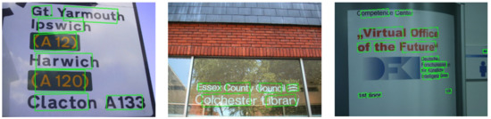 - Karatzas, D.; Gomez-Bigorda, L.; Nicolaou, A.; Ghosh, S.; Bagdanovl, A.; Iwamura, M.; Matas, J.; Neumann, L.; Chandrasekhar, V.R.; Lu, S.; et al. ICDAR2015 competition on robust reading. In Proceedings of the 12th International Conference on Document Analysis and Recognition (ICDAR), Oradea, Romania, 11–12 June 2015; pp. 1156–1160. [Google Scholar]