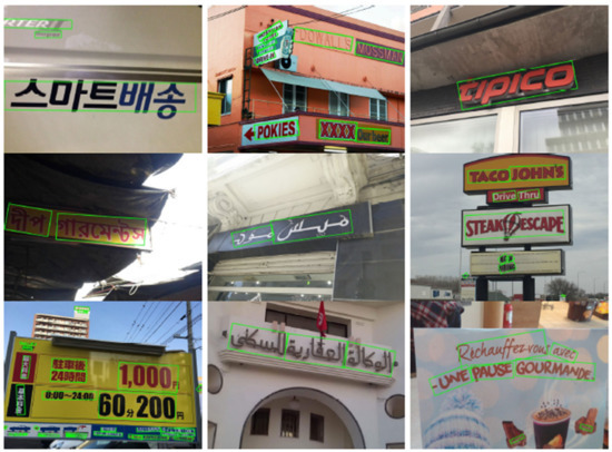 - Nayef, N.; Yin, F.; Bizid, I.; Choi, H.; Feng, Y.; Karatzas, D.; Luo, Z.; Pal, U.; Rigaud, C.; Chazalon, J. ICDAR2017 robust reading challenge on multi-lingual scene text detection and script identification-rrc-mlt. In Proceedings of the 12th International Conference on Document Analysis and Recognition (ICDAR), Kyoto, Japan, 13–15 November 2017; pp. 1454–1459. [Google Scholar]