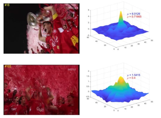 - Bolme, D.S.; Beveridge, J.R.; Draper, B.A.; Lui, Y.M. Visual object tracking using adaptive correlation filters. In Proceedings of the IEEE Conference on Computer Vision and Pattern Recognition (CVPR), San Francisco, CA, USA, 13–18 June 2010; pp. 2544–2550. [Google Scholar]