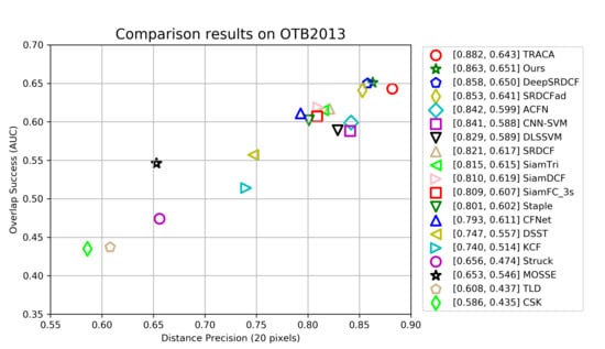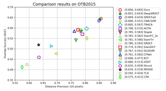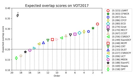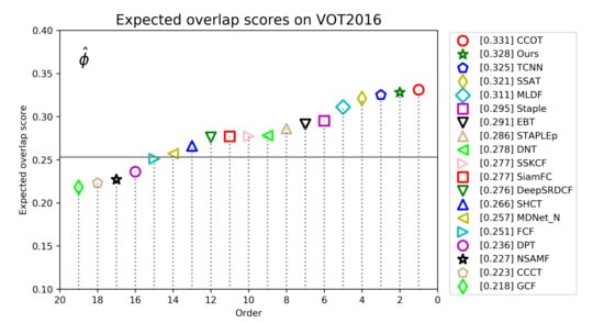 - Lukežic, A.; Vojír, T.; Kristan, M.; Leonardis, A.; Matas, J.; Felsberg, M.; Pflugfelder, R.; Zajc, L.C.; Hager, G.; Eldesokey, A.; et al. The visual object tracking vot2016 challenge results. In Proceedings of the European Conference on Computer Vision (ECCV Workshops), Amsterdam, The Netherlands, 8–16 October 2016; pp. 777–823. [Google Scholar]