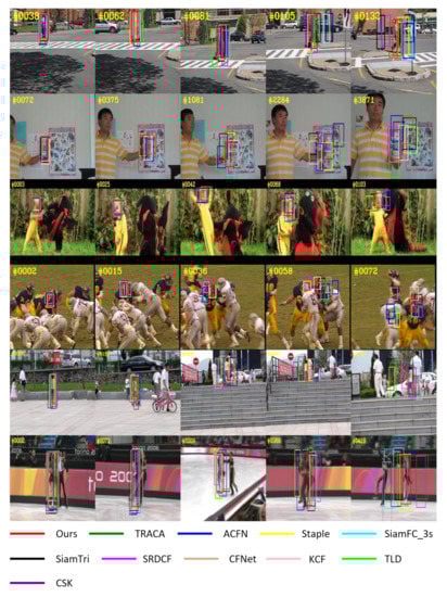 - Mueller, M.; Smith, N.; Ghanem, B. Context-aware correlation filter tracking. In Proceedings of the IEEE Conference on Computer Vision and Pattern Recognition (CVPR), Honolulu, HI, USA, 21–26 July 2017; pp. 1387–1395. [Google Scholar]