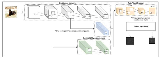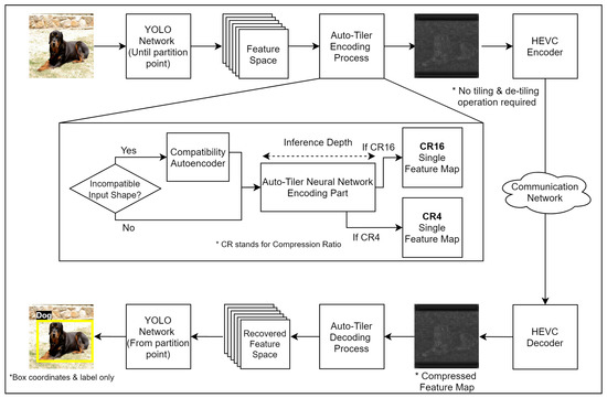 Based on this approach, we designed an auto-tiler network so that it can compress the input feature space into two different output dimensions. These output dimensions are (416, 416, 1), (208, 208, 1), which compress the feature space of the 15th, 24th, and 36th layers by 4× and 16×, respectively. Its compression ratio is increased by 2× as the partition depth gets shallower. That is, when compressing the 11th layer activation the compression ratio will be 8× and 32×, and when compressing the 4th layer it would be 16× and 64× respectively. This is due to the compatibility autoencoders compressing the 11th and 4th layer activation by 2× and 4× in order to make it compatible with a core auto-tiler. As a result, an auto-tiler network will support a CR from 4× to 64×. The structure of an autoencoder, auto-tiler, and compatibility autoencoders is shown in Figure 8.
