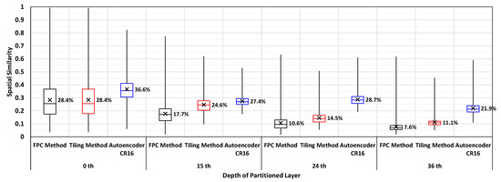 To verify that our proposed method is more structurally stable after compression than the existing methods, we measured the structural similarity (SSIM) [31] of auto-tiler CR4-16, FPC and tiling method over all partitioned layers. SSIM is measured using FFmpeg library [30] with the losslessly encoded feature space as a reference data. SSIM value is within the range of −1 to 1, where 1 denotes that the target is an exact match to the reference data and −1 represents that the target is most dissimilar. The result is shown in Figure 10. It is clearly demonstrated that auto-tiler exhibits markedly higher SSIM than the existing methods over all Kbpi setting. This illustrates that our proposed method allows a more efficient compression by suffering less from compression artifacts resulting from blocky edges of tiled feature maps, or inefficient compression arising from small-sized feature maps and increased header cost of FPC method.