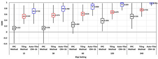 Structural similarity (SSIM) measurement result for FPC, tiling, and auto-tiler method at different Kbpi setting.