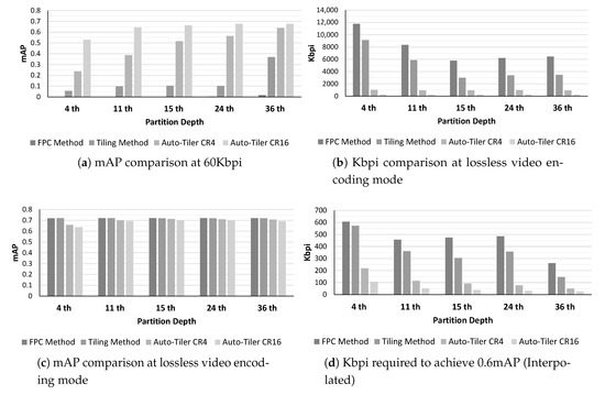 We also compared mAP at 60 Kbpi, Kbpi at lossless video encoding mode, mAP at lossless video encoding mode, and Kbpi required to achieve 0.6 mAP. The result is shown in Figure 12. At 60 Kbpi, the auto-tiling method showed substantially higher mAP compared to the FPC or Tiling method which only uses video encoders to compress. Versus FPC method, an auto-tiler at CR4 mode attained 23.8% to 62.1% higher percent point accuracy, and at CR16 mode it showed 53.0% to 67.3% higher percent point accuracy. However, comparing an auto-tiler results with the FPC method was nearly pointless as the accuracy of that method was near 0%. We then compared an auto-tiler with the Tiling method and achieved 18.2% to 46.1% higher percent point accuracy when using CR4 mode, and 30.8% to 57.3% higher percent point accuracy when using CR16 mode. When losslessly encoded using HEVC codec, CR4 quality auto-tiler achieved 3.2× to 9.0× higher compression ratio compared to those of Tiling method, and CR16 quality auto-tiler achieved 22.0× to 32.8× higher compression ratio. When compared to the FPC method, CR4 mode auto-tiler achieved 6.1× to 11.6× higher compression ratio, and CR16 mode achieved 11.4× to 42.3× higher compression ratio.