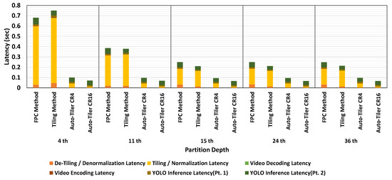 Each latency component is explained as follows—YOLO inference latency (Pt. 1) is the time it takes to propagate through the network until the partitioned layer for Tiling and FPC method, and output of the encoding part of an auto-tiler for auto-tiling method. Tiling and normalization latency is a latency needed to tile the feature space if needed, and normalize the frame into a format that is supported by video encoders. Video encoding latency and video decoding latency is the time required to encode and decode the processed frames using HEVC video codec. De-tiling and denormalization latency is the time required to de-tile the frame if needed, and denormalize the frames to recover the feature space sent from the partitioned layer. YOLO inference latency (Pt. 2) is the time it takes to propagate through the rest of the partitioned network, including the decoding part of an auto-tiler when measuring the latency for an auto-tiling method. Network latency is not measured and is considered to be the same since we compressed the intermediate activations at the same bitrate of 60 Kbpi during measurement.