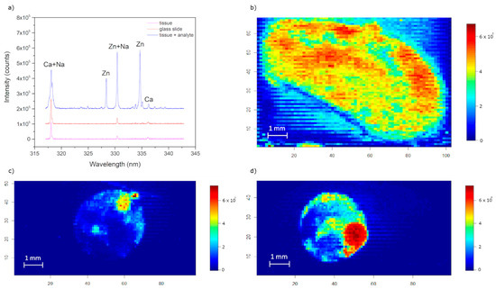 (a) Typical laser-induced breakdown spectroscopy (LIBS) spectrum of three different regions in a sample: kidney tissue—magenta color, glass slide with paraffin—red color, zinc drop on the mouse kidney—blue color. Spectra were rearranged vertically for a better clarity. False color map of: (b) calcium line Ca I 336.19 nm in kidney tissue; (c) zinc drop on soft tissue (Zn I 334.5 nm); (d) zinc drop on soft tissue with previously optimized parameters (Zn I 334.5 nm).