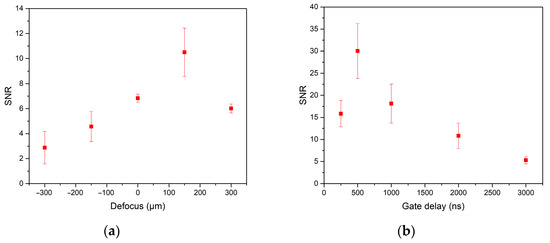 (a) The SNR dependence on defocus for zinc spectral line 334.50 nm. Negative defocus means focusing the collection optics above the sample surface, positive defocus means focusing the collection optics under the sample surface, zero stands for the sample surface. (b) The SNR dependence on gate delay.