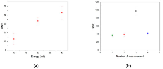 The signal-to-noise dependence on laser energy for 10 to 30 mJ with a step of 10 mJ was studied. It was apparent that the higher the energy of the laser pulse was, the higher the ablated amount of material was and, in turn, the intensity of the analytical line (Figure 4a). However, it must be remembered that the higher the energy is, the larger the craters are and, in turn, the lower the spatial resolution of the LIBS imaging will be. The trade-off between sensitivity and resolution must be established for each sample before further analyses are pursued.