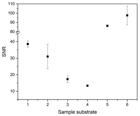 Despite all the analyte drops having the exact same concentration, the SNR value significantly varied for each substrate type. The highest SNR value was observed for murine kidney tissue, most likely because the experimental parameters were optimized for this specific substrate. Optimization would need to be done for each kind of substrate separately to achieve the ideal conditions. From these results, we can conclude that the substrate significantly affects the signal.