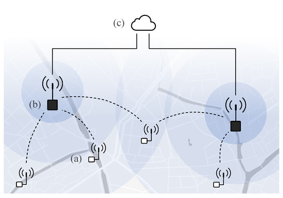 The typical architecture connects remote IoT nodes (a) via long-range connectivity to one of more gateways or base stations (b). The interconnected gateways relay the information to the server or cloud resources (c), where data can be visualized and interpreted.