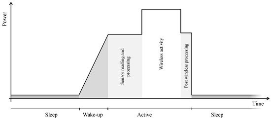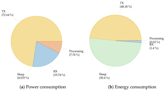 Power consumption and energy consumption share of each stage of a Long-Range Wide-Area Network (LoRaWAN) node. The energy corresponds to reading out a sensor and send ing a 16 bytes payload packet (SF12) every hour [18].