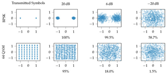 Constellation diagrams of BPSK and 64-QAM modulated symbols at different SNRs including the percentage of successfully demodulated symbols. It demonstrates that low-order modulation schemes are vital in order to work in low-SNR environments or when the transmit power levels are low.