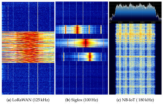 Measured waterfall spectrum of LoRaWAN, Sigfox and NB-IoT. The vertical axis represents the time and the horizontal axis the frequency domain. Due to the difference in time and frequency allocation, the figures have not the same time and frequency scale. The observed spectral leakage is due to the Fast Fourrier Transfomation (FFT) operation.