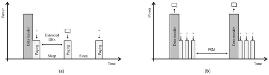 Energy saving strategies employed in NB-IoT, i.e., Extended Discontinuous Reception Mode and Power Saving Mode, respectively. (a) Listen more infrequently to downlink message with eDRX. (b) Hibernate between data transmissions with PSM.