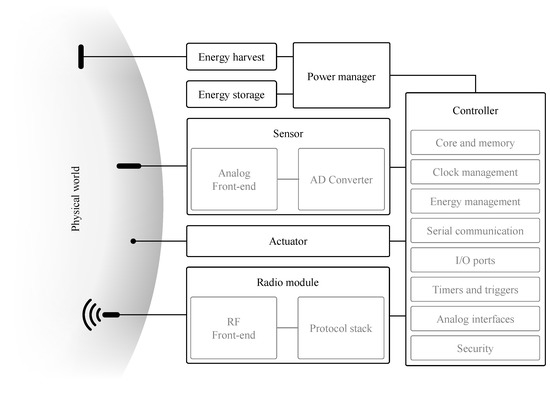 The IoT node’s operation is controlled by the microcontroller by executing embedded software, also referred to as firmware. Core clock frequencies can range in order of magnitude from 10 to 100 . The clock frequency affects both processing speed and power consumption (see Section 4 for more details). Control over the node’s embedded hardware is facilitated by the controller’s broad range of built-in peripherals. General-Purpose Input/Output (GPIO) allows for driving basic digital signals, e.g., enable/disable subsystems, as well as reading from them, e.g., status indicators. Hardware support for digital serial protocols [42], such as, Serial Peripheral Interface (SPI), Inter-Integrated Circuit (I2C) and RS232 help with interfacing with subsystems such as, the radio module or the sensors.