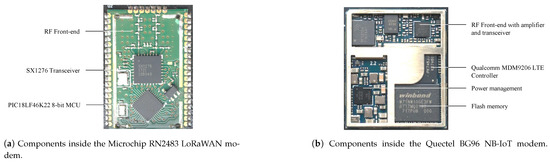 Modems combine RF front-end, transceiver and MAC layer implementation on a controller in one easy to use module. These examples show the internal components of two popular IoT modules. While the building blocks of these modules are independent of their manufacturer, these modules are chosen because of their high availability and adoption in IoT nodes.