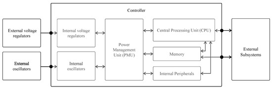 The power inside the controller is managed through the PMU. One task of the PMU is providing a constant supply voltage to components inside the controller. Another task of the PMU is to control power distribution inside the controller, i.e., cut-off or provide power to certain blocks. By doing this, different power states are supported each providing different features. For the well-known Arm-based types of microcontrollers, that are much-used in IoT designs, these are the so-called energy modes.