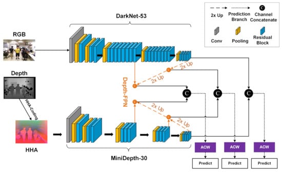 - Asymmetric two-stream network: The network structure consists of two parallel branches, an RGB branch and a depth branch. The RGB branch is based on Darknet-53 from YOLOv3, which consists of 53 convolutional layers for extracting features from RGB images. For the depth stream, a pruned version of DarkNet-53 is adopted based on depth features; this architecture, which retains 30 of the original convolutional layers, is called MiniDepth-30.