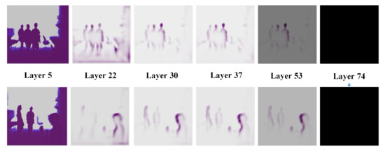 In this paper, we use a convolution visualization tool [36] to visually analyze the output feature maps from Darknet-53 to select a suitable network depth. We select the 5th, 22nd, 30th, 37th, 53rd, and 74th layer as output nodes to observe the object features learned from shallow, middle, and deep layers of DarkNet-53. The visualization results for two depth images are shown in Figure 2. Near the middle layers of Darknet-53 (for example, layers 30 and 37), more prominent edge contour features can be captured, while background and nontarget information can be effectively suppressed. In shallow layers (such as layers 5 and 22), the captured features contain more background redundancy due to the insufficient nonlinear mapping capabilities of the network. When the network depth reaches layer 53 or higher, the gradient values are very small, which makes the network parameters difficult to update. It will result in an inability to distinguish between foreground and background from depth image.