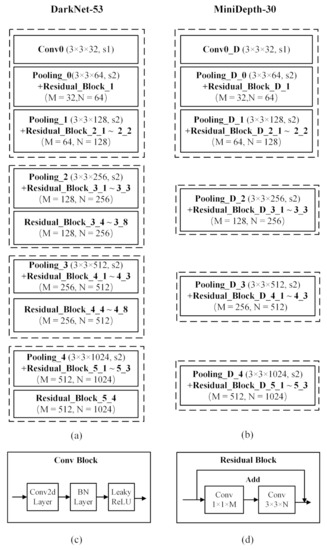 Based on this visual analysis, this paper proposes an asymmetric RGB-D two-stream network with the structure shown in Figure 3. The RGB stream is based on Darknet-53 and contains 52 convolutional layers. The structure of Darknet-53 is shown in Figure 3a. The depth stream is obtained by pruning Darknet-53 such that 30 convolutional layers are preserved; the resulting architecture is called MiniDepth-30. The network structure is shown in Figure 3b. The image input size for the DarkNet-53 and MiniDepth-30 networks are both 416 pixels wide and high.The general structure of a convolutional layer and a residual block are shown in Figure 3c,d. The numbers of residual blocks in the four sections of Darknet-53 are 3, 8, 8, and 4, respectively. For MiniDepth-30, we reduce the numbers of residual blocks in each of the last three sections to 3 and make the outputs dimensionally consistent with the feature maps output by the RGB stream. By reducing the model complexity in this way, the risk of overfitting can be reduced while increasing the speed of the inference process.