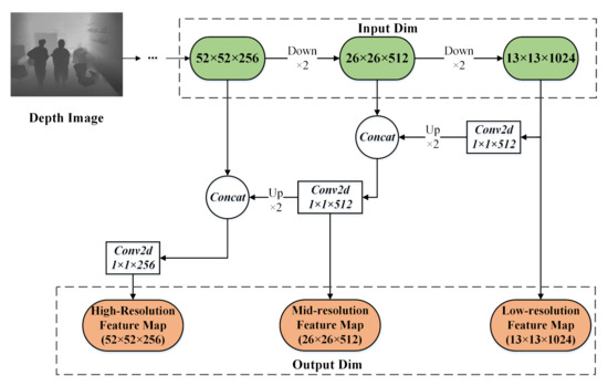 - Depth-FPN: Following MiniDepth-30, we also introduce a feature pyramid structure called Depth-FPN, which can effectively combine deep semantic features and shallow detail features from depth images by means of an upsampling operation. The multiscale depth features are enhanced and extracted so as to exhibit a one-to-one correspondence with the YOLOv3 feature hierarchy on prediction branches of three different resolutions.