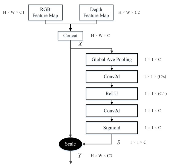 - The ACW module takes an RGB feature map and a depth feature map as inputs, both from the same pyramid level and with the same resolution. First, the two feature maps are concatenated in the channel dimension. The concatenated multimodal feature map is denoted by , where .