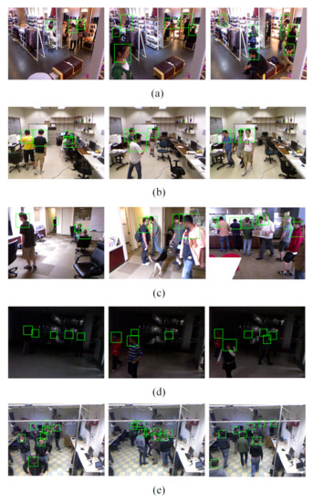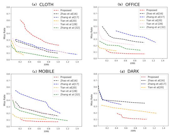 We compared the proposed AAFTS-net with the existing human detectors [16,17,20,28,32] on the CLOTH, OFFICE, MOBILE datasets and plotted the corresponding FPPI-MR curves respectively. To verify the performance of AATFS-net under low-illumination condition, we present the experimental results achieved on the DARK subset for comparison with the results [16,17,20]. The FPPI-MR curve on these four datasets are shown in Figure 6a–d. Since the source codes of comparison methods are not publicly available, we used the results reported by the authors of the respective articles.