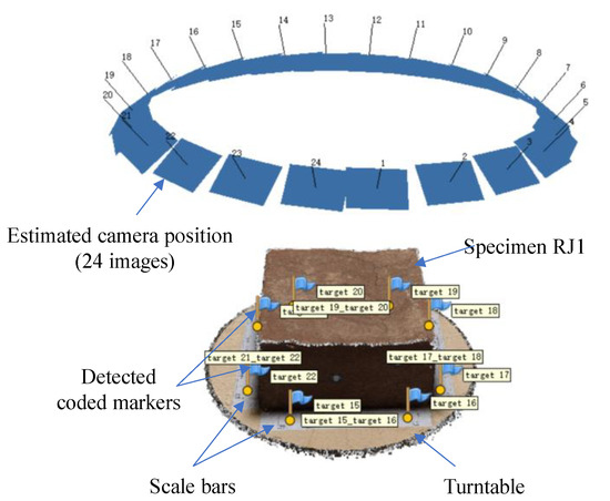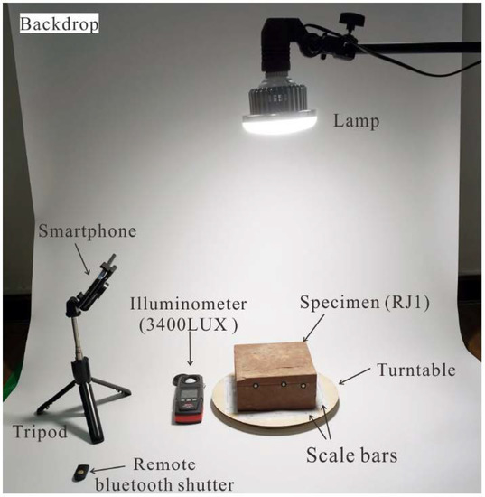 During the image acquisition process, an ordinary table lamp with a semitranslucent lampshade was used to build a diffuse light condition above the specimen, as shown in Figure 4. The illuminance on the specimen surface was 3400 lux, as measured by a PP720 digital lux meter produced by SanLiang company in Guangdong, China. In addition, four designed scale bars with a distance of 10 cm, considered coded markers, were prepared in black-and-white color to offer a better image alignment in the Metashape software, as shown in Figure 4.