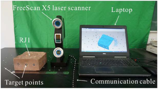 The benchmark data were acquired by using a 3D HLS FreeScan X5 manufactured by the Shining company in Beijing, China (see Figure 5). This ultra-portable laser scanner is suitable for specimens with complex shapes, especially for rock joints with rough surfaces. The maximum resolution of the scanner is 0.1 mm at a distance of 30 cm. The scanning speed of the laser scanner can reach 350,000 dots/s, and all the point information can be synced to a laptop through a USB cable simultaneously. Consequently, the 3D model of an object can be reconstructed in near real time. The detailed parameters of the HLS are given in Table 2.