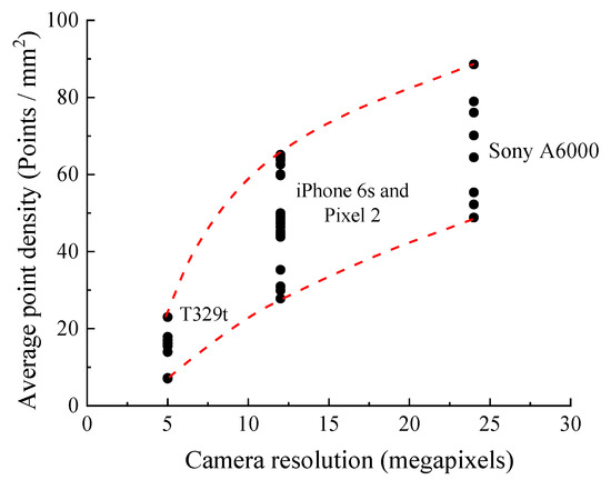 where n is the number of points and s is the size of the SfM model. The two values can reflect the effect of the camera quality on the SfM model. Note that all points of each SfM model are assumed to follow a uniform distribution. For the T329t with a 5 MP camera, the density ρ and interval T are 7–18 points/mm2 and 0.21–0.38 mm, respectively; in addition, both the iPhone 6s and Pixel 2 with 12 MP cameras generate the SfM model with 28–65 points/mm2 and 0.12–0.19 mm, respectively. In addition, the Sony A6000 high-end camera shows a larger density ρ and smaller interval T of 49–89 points/mm2 and 0.11–0.14 mm, respectively. Figure 8 shows the average point density of each SfM model with different camera resolutions. As the camera resolution increases, the density ρ of the SfM models increases nonlinearly.