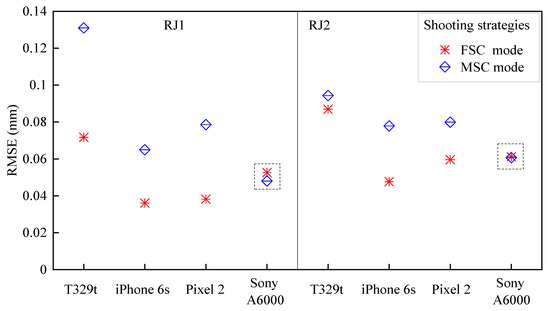 The root mean square error (RMSE) of the SfM models of RJ1 and RJ2 with the different cameras and different shooting angles under the FSC mode.