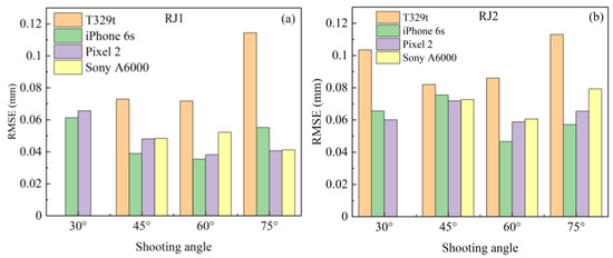 Comparison of the RMSE of the SfM models with the different shooting angles under the FSC mode, (a) specimen RJ1, (b) specimen RJ2.
