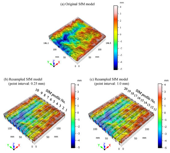 Considering the excellent performance of the SfM model using the Pixel 2 with a 60° shooting angle, the model of RJ1 was applied to conduct the 2D JRC evaluation. Figure 12 shows the original SfM model and two resampled SfM models with point intervals of 0.25 and 1.0 mm, respectively. As the point interval increases, the resolution of the resampled SfM model gradually decreases. The 2D profiles no. 1–10 and profiles no. 11–20 are extracted from resampled SfM models with point intervals of 0.25 and 1.0 mm, respectively (see Figure 12). Additionally, twenty 2D profiles were extracted from the resampled HLS models at even spacing as a benchmark.