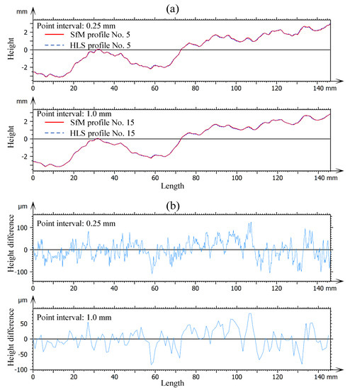 Comparison of the SfM and HLS profiles with different point intervals of 0.25 and 1.0 mm (a) from the height of profiles and (b) from the height difference of profiles.