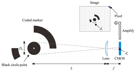 To ensure that all the coded markers can be automatically detected in Metashape, the diameter of the black circle point Db in the coded markers needs to be limited to a specific size. Based on some preliminary checking, the diameter of the black circle point Db in the image is recommended to be less than 30 pixels. According to the basic principles of optical imaging (see Figure 15), the size of the coded marker on the COMS image sensor is proportional to the actual size of the coded marker as follows: