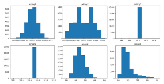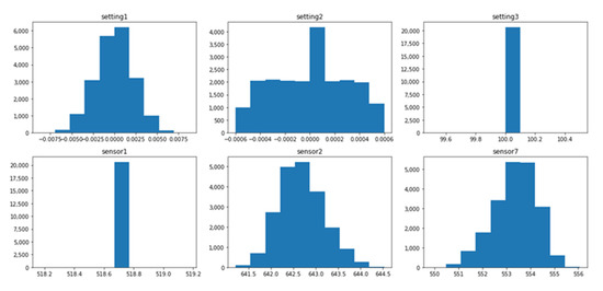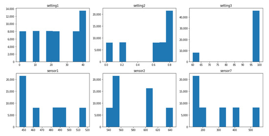 The data distribution of each dataset is different, and this difference is associated with several operating conditions and fault modes, as shown in Table 1. The setting variables and sensor variables can be constant, discrete, and continuous. The same variable can have different data distribution forms in different datasets. For instance, the variable setting1 is a continuous variable with normal distribution in the dataset FD001_train, as shown in Figure 1, while it is a discrete variable distributed on six values in the dataset FD002_train, as shown in Figure 2. Similarly, the variable sensor1 changes from a constant value in the FD003_train, as shown in Figure 3 to a discrete distribution in the dataset FD004_train, as shown in Figure 4. In general, features of dataset FD001 and FD003 are mostly continuously distributed while the features of FD002 and FD004 are discretely distributed.