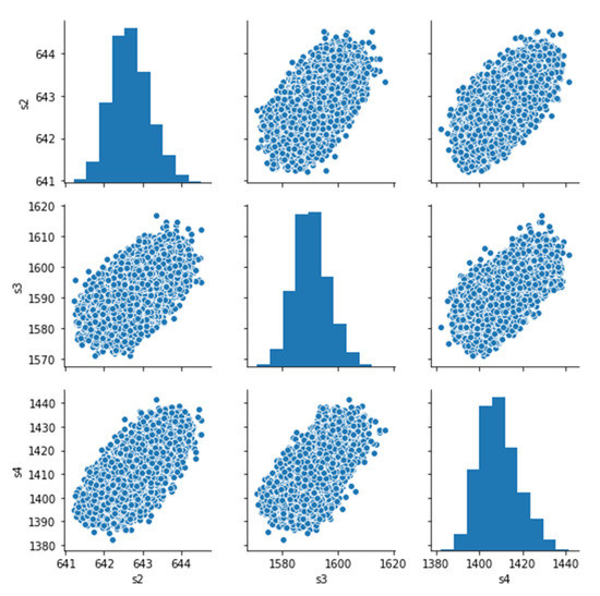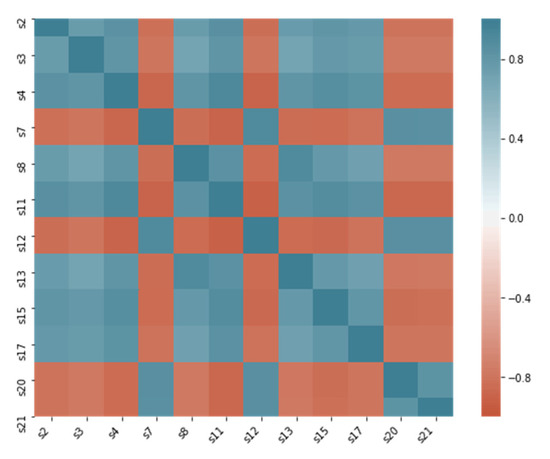 According to our observations, the setting variables’ distributions reflect the operation condition of each dataset. Datasets FD001 and FD003 operate under the same condition and have similar setting variable value distribution. FD002 and FD004 operate under six different conditions, and their variable value distributions are similar. The correlations between features are also strong. Figure 5 presents the correlation plot of variables (sensor2, sensor3, and sensor4) of the FD001dataset., Figure 6 shows that some sensors are highly correlated.