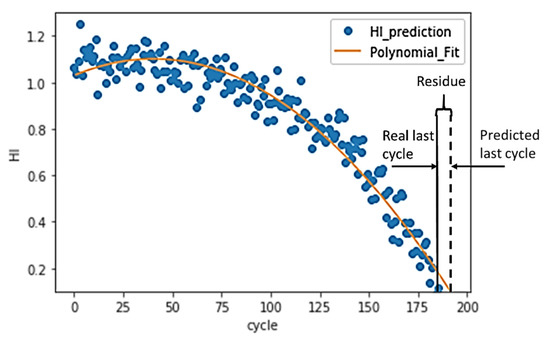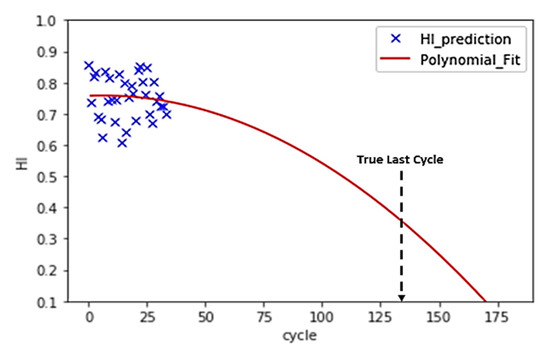 - Since the RUL was not provided in training datasets, a polynomial function was fitted to HIs, and the interception between the polynomial and cycle axis was calculated as the failure point.