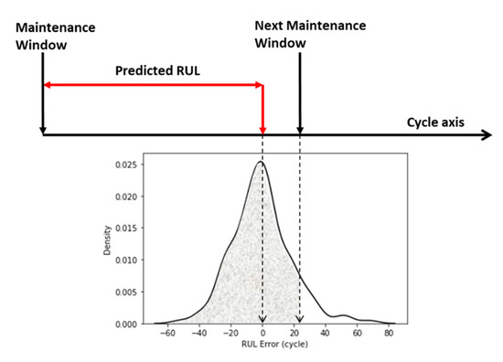 In the scenario of production line risk management, the machine learning-based RUL prediction can help managers to evaluate the possibility of a machine failure before a maintenance window. In large scale manufacturing, the maintenance time is fixed, and multiple machines are maintained in one maintenance window. It is not possible and economical to maintain all machines in one window. Thus, the manager needs to decide on which machines to conduct the maintenance in the scheduled maintenance window. The machine learning-based RUL model can generate a density chart of RUL prediction error. To this end, the manager can estimate the possibility of a machine to fail before the next maintenance window, as shown in Figure 16. The management team can decide whether to add a machine to the current maintenance list or leave it to the next maintenance window.