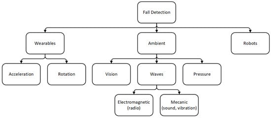 Scientists have employed various approaches to implement FDSs over the past years. They have been classified as presented in Figure 1. Each of them has its strengths and weaknesses. We focus on wearable technologies since we use this approach. Nevertheless, several survey studies [9,10] reported the other methods in more depth.