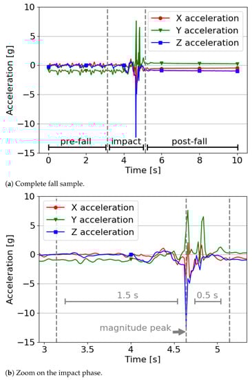 In our experiment, the pre-fall part was very often correctly classified. However, under real conditions, misclassifications may have arisen (for example, as an ADL). This is due to the fact that, in reality, falls are unexpected events occurring perhaps in the middle of an ADL. Therefore, the pre-fall phase may be very short, following immediately from the ADL part of the sample. Whereas in the SisFall dataset (as shown in Figure 3) the pre-fall part is not an ADL, instead, the subject is “preparing” to fall (i.e., the fall is not unexpected). In addition, the setup of the experiment in the wild will not be the same as in the lab. It would lack the annotation, and therefore the behavior of the algorithm may not be the same (in particular, with regards to dividing samples). With real-life non-annotated data, it is unknown whether the received data is a fall, and hence a sample associated to an ADL would also be divided into various parts. This would require further investigation.