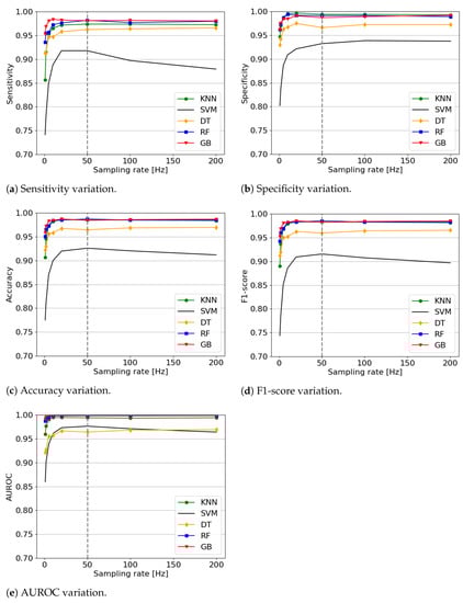 - What is the effect of the sensors’ sampling rate on the fall detection?To study this, we analyzed the influence of the sensors’ sampling rate on the detection. We filtered the data in order to reduce the number of samples measured per second. We then experimented on the filtered data with five ML algorithms. This research question extends our previous work [8].
