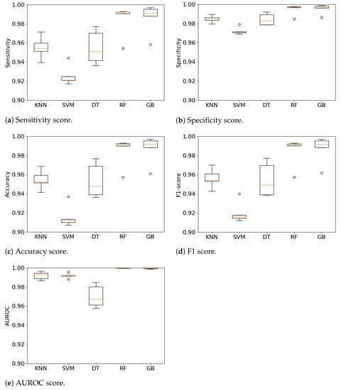 The multi-class approach to identify different phases of falls achieved promising results with an accuracy close to 99% as shown by Figure 5 for two algorithms. The figure presents also the variability of the results over each fold of the cross-validation for each algorithm. The RF and GB algorithms consistently produced good results over the different metrics except for a single fold, which is seen as an outlier in Figure 5a–d. One explanation might be that it is related to data of a subject who performed the ADLs and falls differently to other subjects. The DT algorithm has a the biggest variability across the algorithms followed by KNN. The variability is low, close to 5% from which a high confidence on the algorithms can be inferred. This is the desired behavior for the type of application, where consistency in minimizing both SE and SP is important to facilitate adoption and usefulness of the FDS. Furthermore, the results of this experiment also confirm the expectation about ensemble learning algorithms performance, which had been observed in the results presented in Section 4.1.