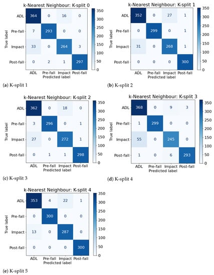 Figure 6 presents a deeper insight of the classification results with the confusion matrices of each split of the k-fold cross-validation for the KNN algorithm. The accuracy of this algorithm is the median amongst all algorithms’ accuracies, therefore it is useful to discuss in depth. We can see that the pre-fall and post-fall phases were consistently correctly classified. The main source of misclassifications comes from the other two classes, i.e., ADL and impact. This negative tendency is stronger in the SVM and DT algorithms but lessened in the RF and GB ones. These confusion matrices are interesting because the patterns of misclassifications are consistent to that expected in a binary detection (i.e., ADL vs. fall). Therefore, an approach could involve removing data associated to the correctly-identified phases of pre-fall and post-fall and treat the problem as a binary classification. However, having correctly isolated and identified these phases, these could be used as a supplementary input to confirm the prediction. Suppose for a given sample, a pre-fall and a post-fall are correctly identified, but the impact is predicted as an ADL. Then, by the mean of a threshold on a confidence interval, the misclassified impact could be overridden and corrected. Another solution could simply consider the fact of identifying a pre-fall and a post-fall phase to always raise an alarm for an impact, given the high confidence of the prediction of both phases.