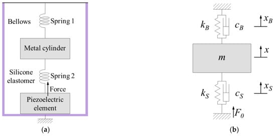 The proposed piezoelectric transducer can be expressed as an equivalent mechanical model consisting of two springs and one mass; its physical motion system is shown in Figure 3a. The physical system can be expressed as a mechanical vibration system composed of a mass (m), two springs (kB and kS), and two dampers (cB and cS) (Figure 3b) [].