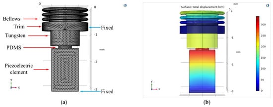 The spring rate of the bellows was derived using Equation (11), and the calculated value was 2059.48 N/m. The critical damping coefficient of the bellows, calculated using Equation (12), was 0.287 N∙s/m. The damping ratio is 0.09, which is derived from the critical damping coefficient []. And the damping ratio of the PMDS was 0.1 []. To apply the energy loss of the transducer by the bellows and PDMS, it was set using the damping of the Solid Mechanics interface; the damping type is Rayleigh damping and the input parameter is the damping ratio. To calculate all dependent variables applied to the model at the same time, the Suggested Direct-Fully Coupled method of Stationary Solver and Eigenvalue Solver were used as the analysis type. The average value of the linear error is 3.73 × 10−11. The factor in error estimate is set to 1.