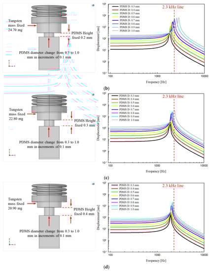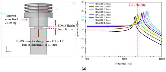 The parametric elements used in the analysis controlled only the diameter and height of the PDMS and the mass of tungsten. In addition, the height of the proposed transducer was fixed at 3.2 mm based on the anatomical structure of the RW niche [], which is the implantation location. Therefore, the combined total height of PDMS and tungsten could not exceed 1.5 mm (total height of the piezoelectric element, housing bottom, and bellows, 1.7 mm). To determine the dimensions of PDMS, the diameter of tungsten was fixed at 1.12 mm, and the analysis was performed while changing the height (from 0.1 to 0.6 mm in increments of 0.1 mm) and diameter (from 0.3 to 1.0 mm in increments of 0.1 mm) of the PDMS. Here, the diameter of tungsten was set as the maximum in consideration of the inner diameter of the bellows, and the mass (volume × specific gravity) of tungsten was calculated numerically, reflecting how the height of tungsten changes with that of the PDMS. Figure 4b shows the total displacement (based on static analysis), which is the result of the FEA, and Figure 5a–f show graphs of frequency–response characteristics (based on dynamic analysis) according to the variable elements of PDMS and tungsten. FEA showed that the greater the PFMS height and the smaller the diameter, the greater the displacement loss from the piezoelectric element to the bellows. Moreover, the smaller the PDMS height, the more clearly the resonance frequency shifted with PDMS diameter. In other words, as the PDMS height was reduced, it became easier to adjust the resonance frequency while reducing the displacement loss. The green line (2.3 kHz) in Figure 5a, and the blue and pink lines (2.1 kHz and 2.3 kHz, respectively) in Figure 5b, are graphs of high displacement in the flat region (below 1 kHz) that satisfy the resonant frequencies targeted in this study. Among them, the green line in Figure 5a was finally selected because the output size of the flat region of the green line (average, 203.2 nm) was larger than those of the blue (average, 108.5 nm) and pink (average, 141.7 nm) lines in Figure 5b. The green line in Figure 5a corresponds to PDMS with a diameter of 0.5 mm and height of 0.1 mm, and tungsten with a diameter of 1.12 mm, height of 1.4 mm, and mass of 26.6 mg.