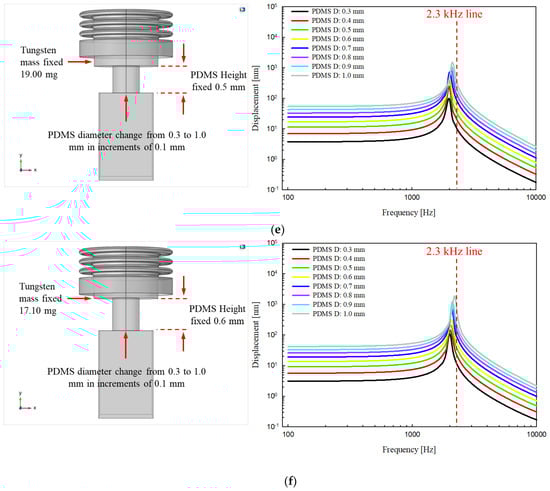 Displacement frequency–response characteristics according to the variable elements of polydimethylsiloxane (PDMS) and tungsten. Fixed parameters: (a) PDMS height, 0.1 mm; tungsten mass, 26.60 mg; (b) PDMS height, 0.2 mm; tungsten mass, 24.70 mg; (c) PDMS height, 0.3 mm; tungsten mass, 22.80 mg; (d) PDMS height, 0.4 mm; tungsten mass, 20.90 mg; (e) PDMS height, 0.5 mm; tungsten mass, 19.00 mg; (f) PDMS height, 0.6 mm; tungsten mass, 17.10 mg.